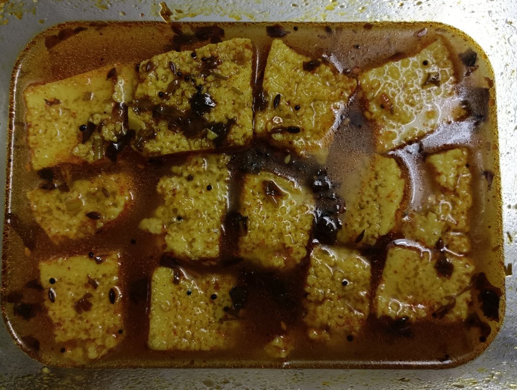 - Put tempering vessel on next stove .Heat up oil and add mustard seeds and wait for crackling sound then add cumin seeds,curry leaves and red chilli and sesame seeds and pour it in dabka’s saucepan.