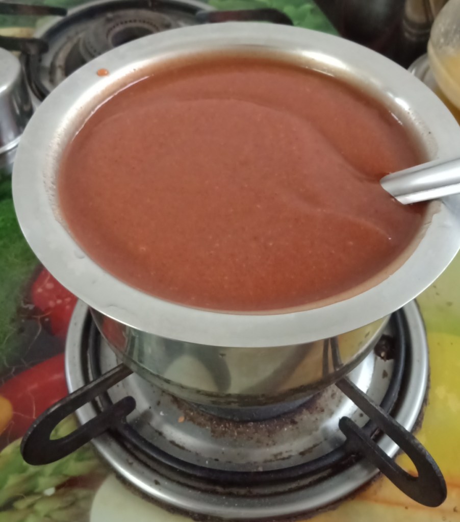 - Strain the puree and again heat to reduce water to get saucy consistency .Stir continuously otherwise it will stick to bottom of the pan.