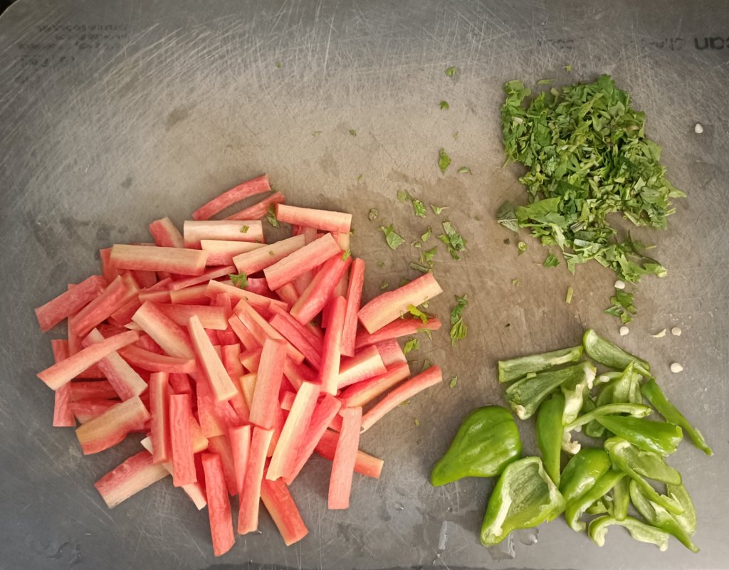 - Wash and finely chop mogri. Marinate with salt and keep aside.
