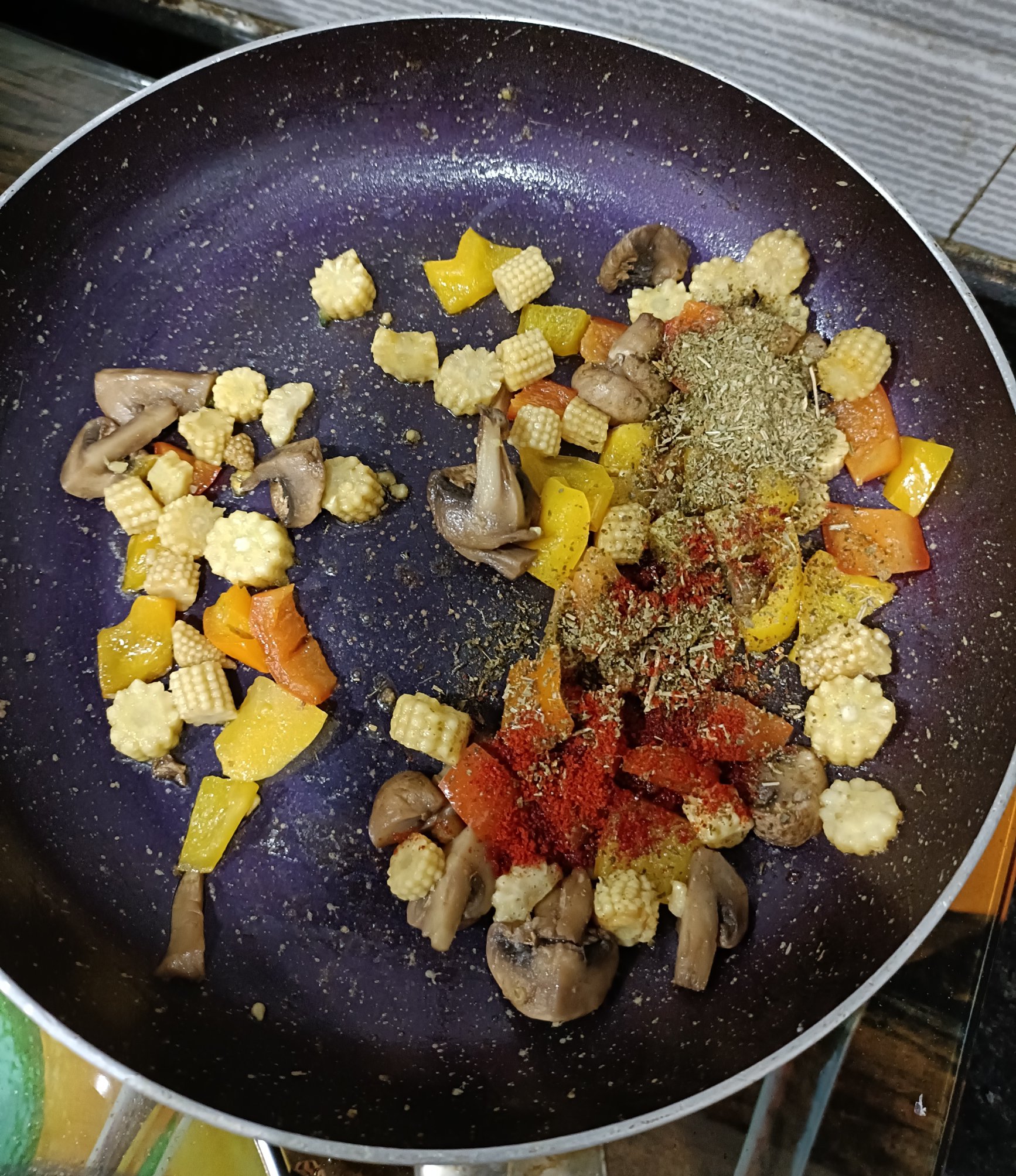 - Mix thoroughly after adding salt, mixed herbs powder and red chilli powder .Keep aside.
