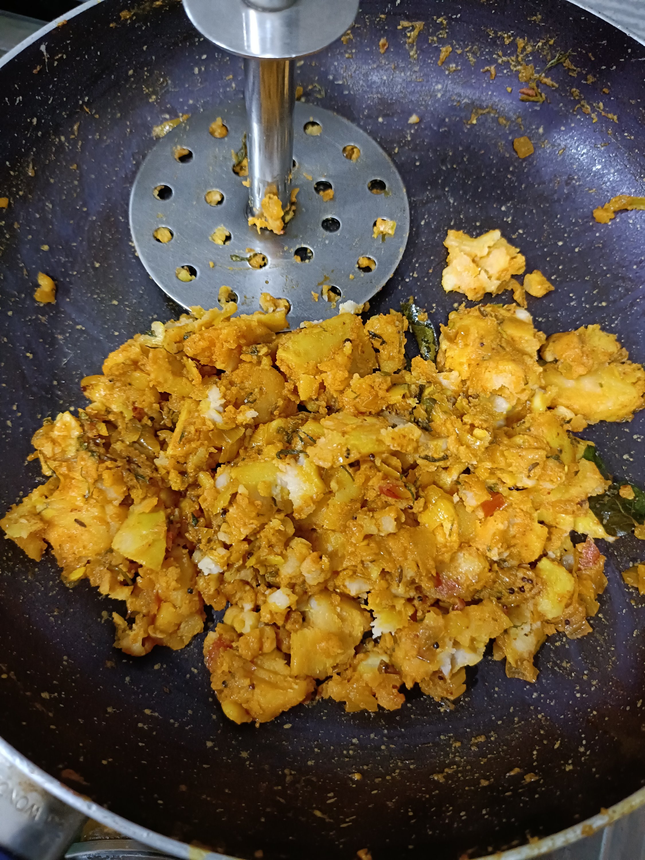 - Wash and cook potatoes upto 2 whistles. When pressure is released open the lid and take out boiled potatoes. Remove skin and mash potatoes with potato masher. Mix half quantity of salt and keep aside.