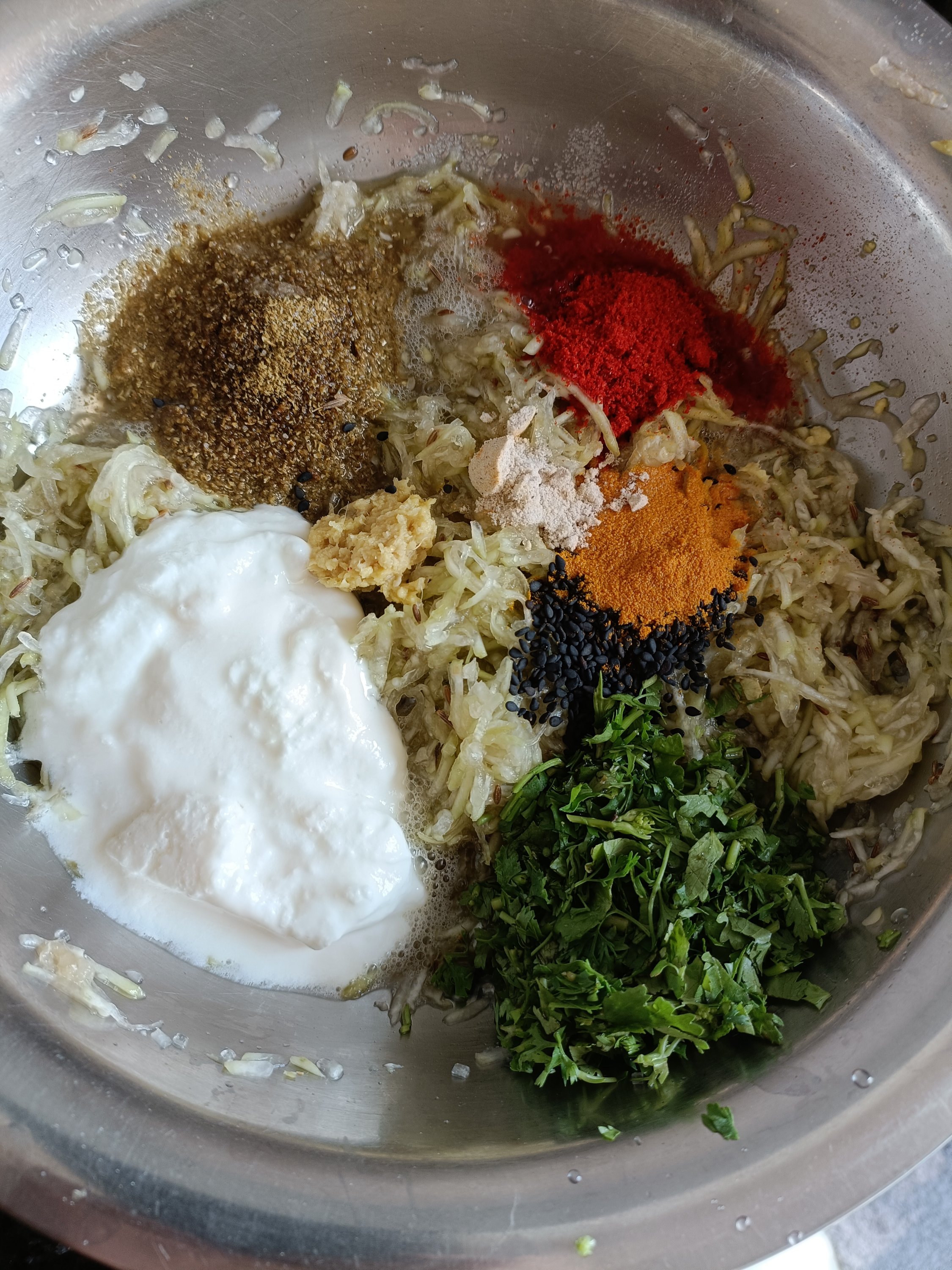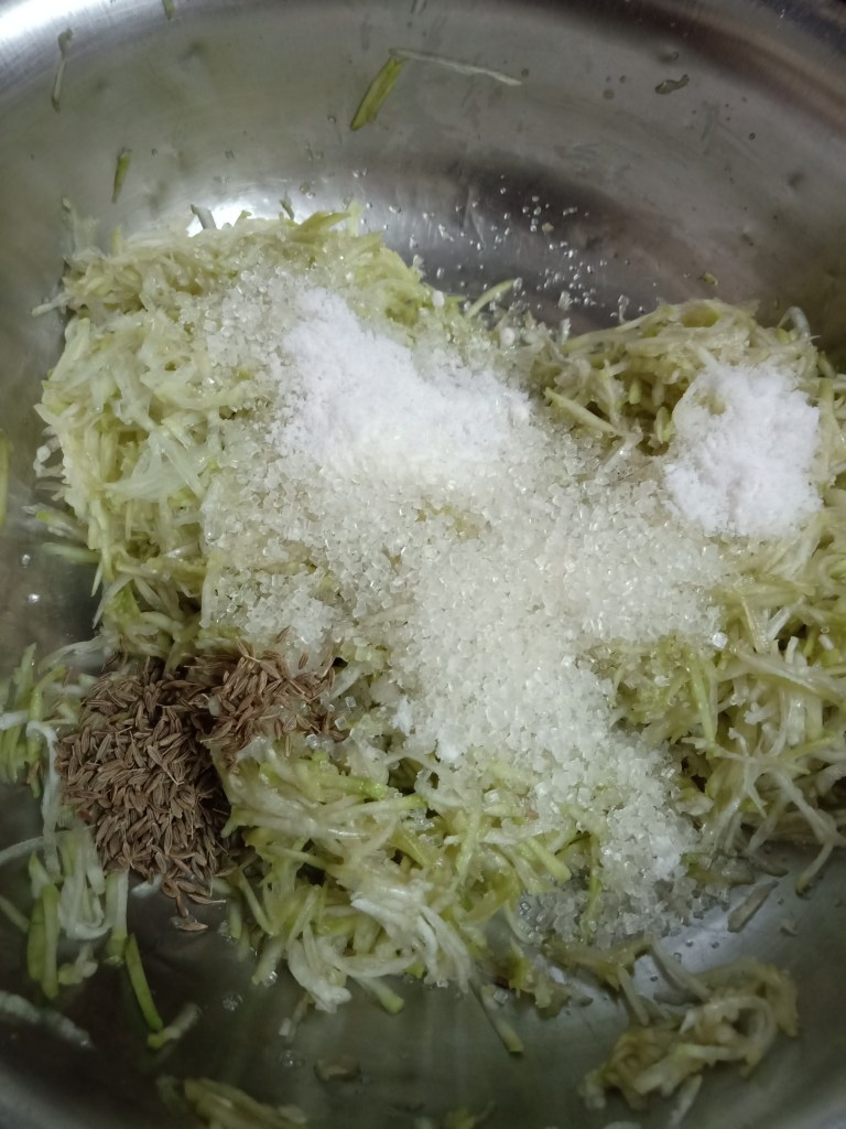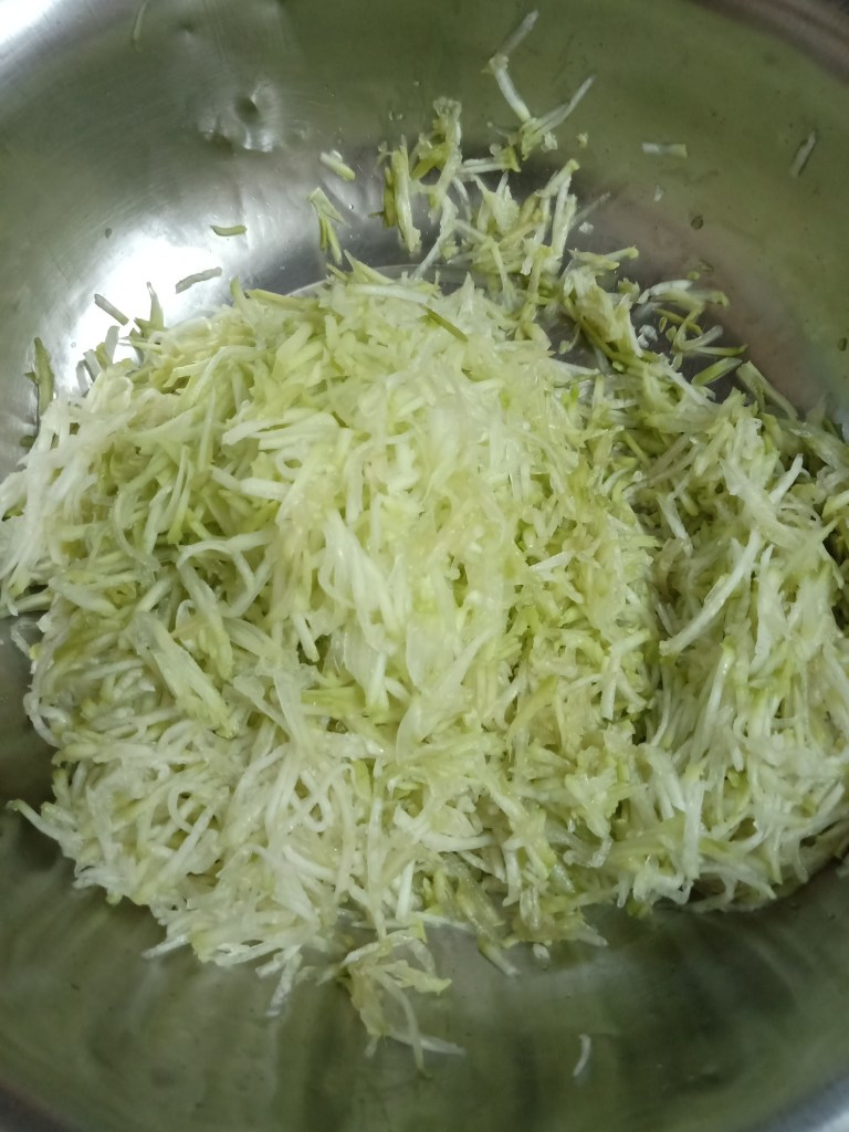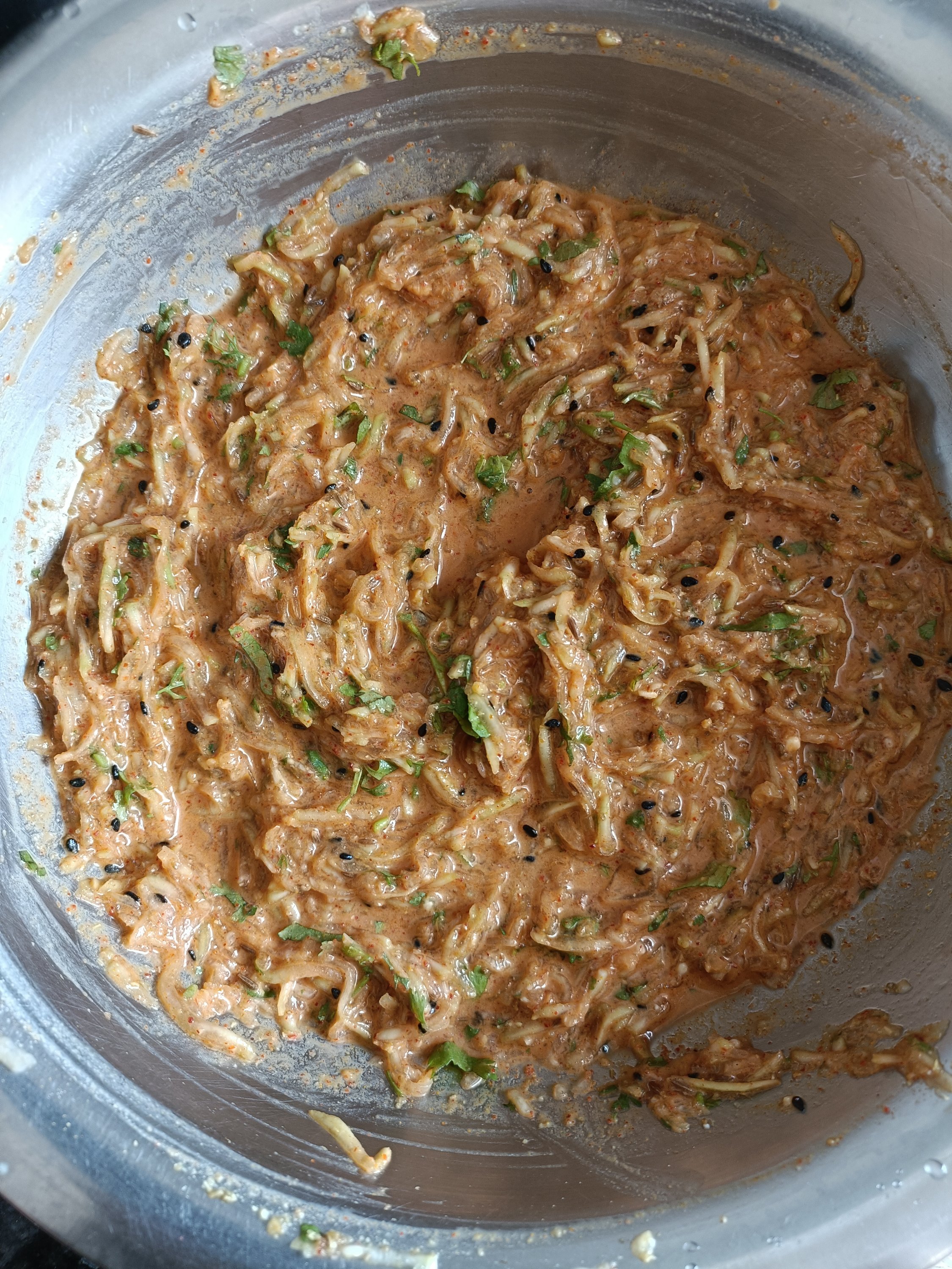 - Drain all water and add dal, finely cut 2 inches ginger, 2-3 green chillies, ½ cup Coriander leaves and salt. Grind it in a mixture grinder and make smooth batter without water.
